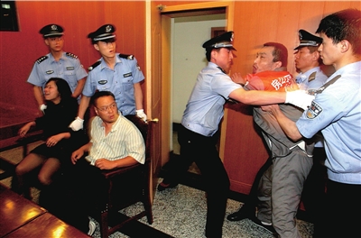 張文明的妻子看到后馬上跳起來(lái),雙手拍著桌子大喊“我有意見(jiàn)!”她大聲嚎哭,一頭向原告席沖過(guò)來(lái),要打死者家屬,被法警攔住。與此同時(shí),黃老漢的兩個(gè)女兒也大聲喊著“就應(yīng)該槍斃你!”試圖沖過(guò)法警的防線上前廝打。而張文明眼睛布滿紅血絲,拼命掙脫并大喊“我有話說(shuō)!”一時(shí)間兩群人亂作一團(tuán),喊叫和嚎哭聲此起彼伏。