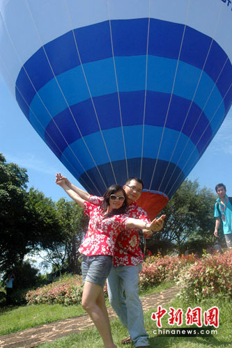 全國的30支熱氣球隊來助興。在?谌f綠園上空漂游的熱氣球上,北京的劉先生突然“變出”一枚鉆戒向女友求婚。他笑著說,從網上看到海口旅游婚慶的消息就瞞著女友報了名,為的是上演在熱氣球上求婚一幕。