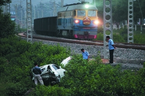 昨日(13日)下午,京承鐵路線順義區(qū)李天路鐵道口,一輛本田轎車闖過道桿,與一列貨運列車尾部相撞。轎車內母子被救出,此時一列客運列車開來,轎車又被撞出數(shù)十米遠并跌落在路旁溝內。