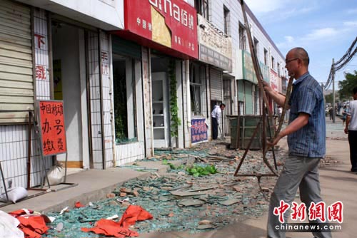 記者在王家山鎮(zhèn)街道上的多家店鋪內(nèi)看到,櫥窗玻璃許多破碎,店內(nèi)陳列的服裝、藥品、通訊器材、食物等布滿塵土,一些店內(nèi)震落的天花板懸在半空搖搖欲墜,還有一些商店的墻體不同程度出現(xiàn)裂紋。