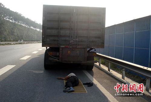 22日上午9時40分,在連霍高速公路634KM南半幅,記者看到了驚險一幕:一牌號為豫HD260掛的大貨車停在應急車道上,司機側臥于其貨車后酣睡不醒,過往車輛紛紛繞行。交警了解后得知,劉某因為看世界杯太疲勞才拿高速路當床睡。(完)