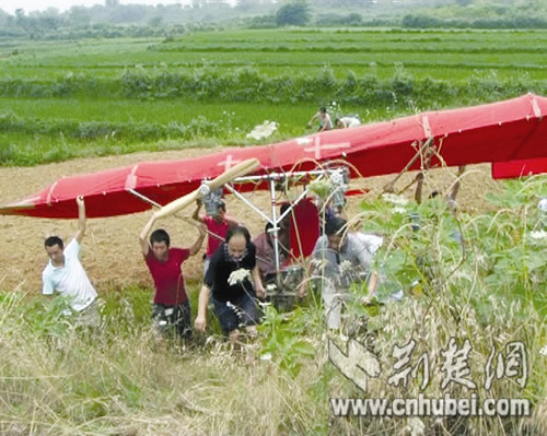 5月10日,武漢東湖開發(fā)區(qū)農(nóng)民舒滿勝,花費(fèi)10萬元自造土飛機(jī),試飛失敗并受皮外傷。昨日上午,舒滿勝的土飛機(jī)再次試飛,未像上次一樣通知媒體,當(dāng)?shù)夭糠执迕衲繐袅巳^程。據(jù)目擊者胡先生介紹,昨日上午9時(shí)許,舒滿勝的土飛機(jī)就被拉到江夏區(qū)五里界鎮(zhèn)醬栗廟路段,在經(jīng)過三四十分鐘的試驗(yàn)性滑行后,于上午10時(shí)準(zhǔn)時(shí)起飛。土飛機(jī)“助跑”約200米后,舒滿勝拉動(dòng)起飛桿,飛機(jī)輪滑輪脫離地面,機(jī)身離地面只有兩三米,飛行不過10米,一頭栽進(jìn)路邊稻田里(如圖),舒滿勝被甩出飛機(jī)左腿受傷。隨后,舒滿勝被送往流芳醫(yī)院。經(jīng)檢查,其左腿髕骨骨折,需手術(shù)治療。