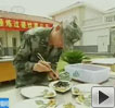 【解說】在觀眾的熱情邀請下,曹師傅又表演了一個(gè)他的拿手絕技,在氣球上切肉絲。氣球下面放著三根鋼針,肉放在氣球的上面,用刀切成粗細(xì)均勻的肉絲而氣球卻沒有破。讓市民真正感受到了大師的風(fēng)采。
