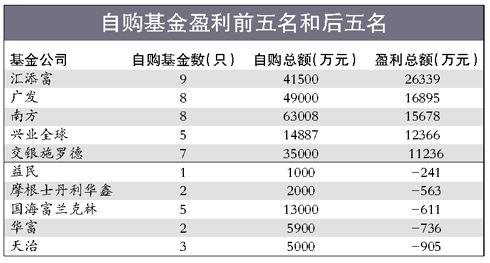 據(jù)統(tǒng)計,截至8月17日,40家自購盈利的基金公司中,盈利最多的前10家依次是匯添富、廣發(fā)、南方、興業(yè)全球、交銀施羅德、華夏、工銀瑞信、易方達(dá)、嘉實、長盛,其中盈利超過2億元的公司只有匯添富,累計盈利2.6億元;超過1億元的有4家,分別是廣發(fā)、南方、興業(yè)全球和交銀施羅德。