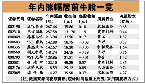 流通盤股本不大,是年內(nèi)牛股的又一大特點(diǎn)。前20名牛股中,中小板股票有8家,占四成。而流通股本超過2億股的只有7家;流通股本在2億股以下的有13家(含2億股),占全部20家公司的65%,其中,漲幅居前的幾只牛股中,有三只流通盤在7000萬股以下。大牛股東方園林(002310)是一只流通盤才2175萬股的袖珍小盤股(送股前),成飛集成總股本不過是2.06億股,流通股本6504萬股,是典型的“大行業(yè)、小公司”。(李成 )