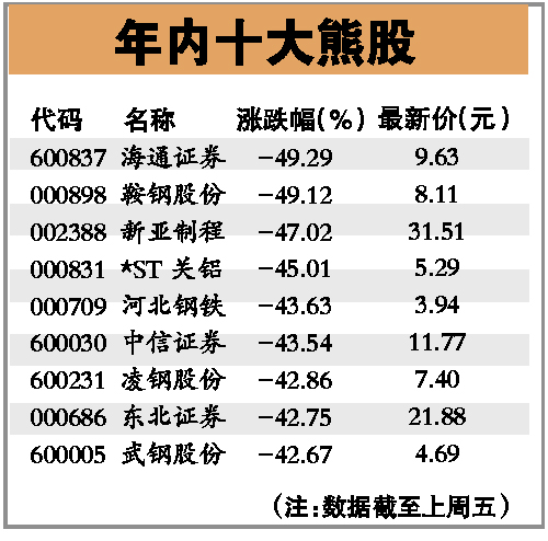盡管截至上周五,大盤年內(nèi)跌666.40點(diǎn),跌幅高達(dá)20.33%,不過,許多股票卻創(chuàng)出歷史新高。本報統(tǒng)計發(fā)現(xiàn),截至上周五,兩市A股中,有100多只股票年內(nèi)漲幅超過50%,20只股票年內(nèi)漲幅超過100%,三只股票年內(nèi)漲幅更是高達(dá)200%以上(含200%)。