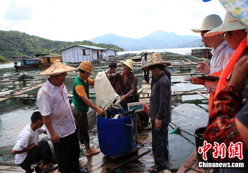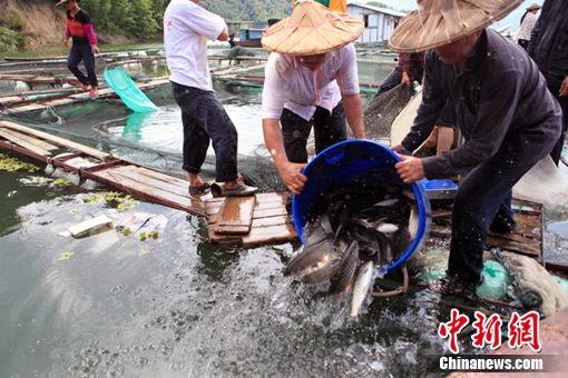 自7月8日起,福建永定縣棉花灘庫區(qū)因受上杭紫金山銅礦濕法場廢水外滲出現(xiàn)大量死魚現(xiàn)象后,永定縣政府采取措施,派出工作組分赴各網箱養(yǎng)殖場統(tǒng)一收購受污染的魚。對于死魚和難以存活的魚,進行無害化集中填埋,并制訂“網箱上岸、破網入庫”等有效措施,對網箱里存活的魚,同樣按綜合價每斤6元進行統(tǒng)一收購,并及時放入大庫。盧基瑩 賴初源/攝