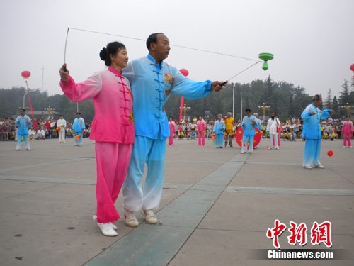 在保定人民廣場主會場,近千名空竹愛好者在空竹大師吳春鳴的帶領(lǐng)下,通過“群英薈萃”、“龍飛鳳舞”、“竹韻聲聲”、“激情飛揚(yáng)”等表演,把空竹的盤、拋、接等技巧表現(xiàn)的淋漓盡致。場上巨型空竹、雙人空竹、輪滑空竹、頂竿空竹、呼啦圈空竹漫天飛舞,蔚為壯觀。
