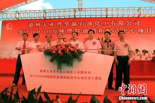 總投資53.9億元人民幣,設(shè)計年生產(chǎn)能力達(dá)1000萬噸的廣東惠州大亞灣華瀛石油化工有限公司燃料油調(diào)和配送中心項目9日正式動工建設(shè)。該項目是廣東省重點項目,建成投產(chǎn)后或?qū)⒊蔀橹袊畲笕剂嫌驼{(diào)和配送中心。 圖為惠州市委書記黃業(yè)斌宣布惠州大亞灣華瀛石油化工有限公司燃料油調(diào)和配送中心項目開工?敌⒕ 攝