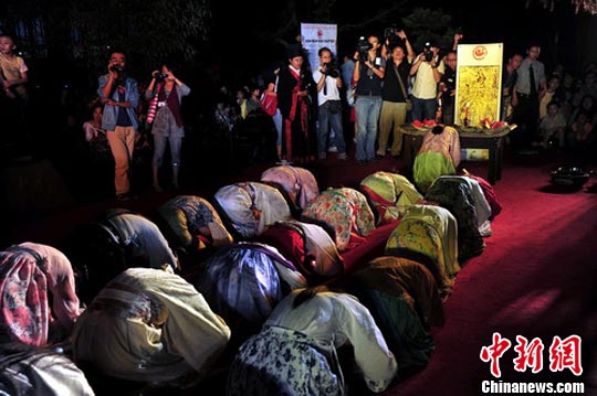 中秋之夜,大雅堂前,多名身著唐裝的美女,“經(jīng)坐”(即雅坐)于席上,行祭拜禮,主祭者“三上香”后,念誦祭月祝文。拜月禮成后,祭拜人員和全體觀眾分食月餅、供果等祭品,宴飲賞月。“品月食以賞花,飛羽觴而醉月!