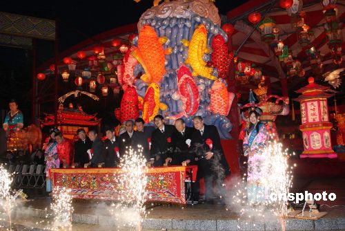 長崎市中心1月26日在主要街道掛起了15000盞中國傳統(tǒng)的提燈和各式彩燈。數(shù)以萬計(jì)的長崎市民和在長崎華僑華人一起走上街頭、徜徉燈海,同慶中國春節(jié)。圖為此次燈會的主會場長崎市湊公園于當(dāng)晚6時(shí)舉辦了盛大的點(diǎn)燈儀式。中國駐長崎總領(lǐng)館總領(lǐng)事滕安軍、當(dāng)?shù)厝A僑華人代表劉濟(jì)昌與長崎縣副知事立石曉、長崎市市長田上富久等人一起啟動(dòng)點(diǎn)燈按鈕。 中新社發(fā) 關(guān)妍 攝