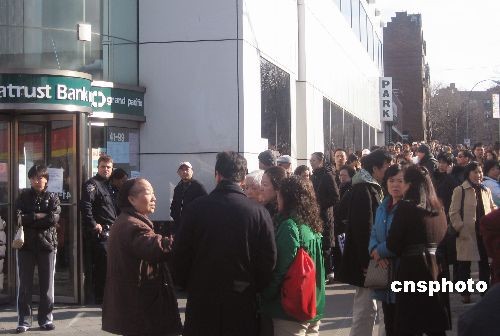 美國(guó)紐約華資背景的中國(guó)信托銀行紐約法拉盛分行,存放個(gè)人貴重物品的數(shù)十個(gè)保險(xiǎn)箱9日被盜。10日一早,大批華人憂心忡忡聚集在被盜銀行門(mén)前,希望了解具體情況。美國(guó)法律規(guī)定,保險(xiǎn)箱內(nèi)所存現(xiàn)金即便被盜也不獲賠付,很多華人一生積蓄恐因此付諸東流。中新社發(fā) 魏晞 攝