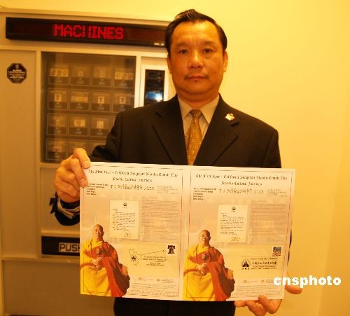 3月26日,中美集郵中心主任魏進(jìn)發(fā)在洛杉磯展示以少林寺為圖記的紀(jì)念郵戳。美國加州郵局為慶祝“中國嵩山少林寺日”,特采用中美集郵中心設(shè)計的首日封圖案,分別為舊金山地區(qū)和洛杉磯地區(qū)刻制了2枚圖案不同的精美郵戳,這是目前在中國境外唯一的以少林寺為圖記的紀(jì)念郵戳,這2款紀(jì)念郵戳將被美國郵政博物館收藏。中新社發(fā) 盧威 攝