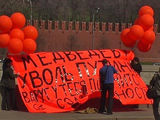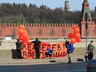 據(jù)俄羅斯新聞網(wǎng)報(bào)道,俄羅斯反對黨“團(tuán)結(jié)運(yùn)動(dòng)”組織成員4月28日在克里姆林宮前舉行了聲勢浩大的反政府游行活動(dòng)。期間,3名“團(tuán)結(jié)運(yùn)動(dòng)”的積極分子在克里姆林宮附近的河岸邊懸掛紅色的巨型橫幅,上面印有:“梅德維杰夫,辭去普京總理職務(wù)。”字樣,橫幅兩邊系有紅色的氣球,橫幅下部印有“團(tuán)結(jié)運(yùn)動(dòng)”組織的徽標(biāo)。