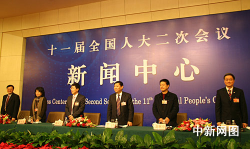 3月6日下午,出席十一屆全國人大二次會議的5位企業(yè)家代表在大會新聞中心(梅地亞中心多功能廳)就“企業(yè)如何應(yīng)對國際金融危機的挑戰(zhàn)”接受中外記者的采訪。這五位代表是(從左二起)廣東團代表、廣東省珠海格力電器股份有限公司副董事長、總裁董明珠;黑龍江團代表、黑龍江省哈爾濱泰富公司董事長兼總經(jīng)理楊天夫;四川團代表、中國東方電氣集團公司董事長、黨組書記王計;浙江團代表、浙江富潤控股集團有限公司黨委書記、董事局主席趙林中;陜西團代表、中國電子信息產(chǎn)業(yè)集團董事長、黨組書記熊群力。中新網(wǎng)記者 唐偉杰 攝