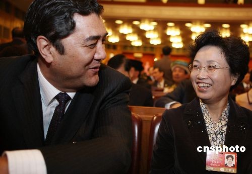 3月9日,十一屆全國人大二次會議第二次全體會議在北京人民大會堂舉行,剛剛利用大會休息日到天津考察鐵路建設(shè)的青海省女省長宋秀巖,向鄰坐的新疆維吾爾自治區(qū)政府主席努爾·白克力請教鐵路建設(shè)的經(jīng)驗。中新社發(fā) 任晨鳴 攝