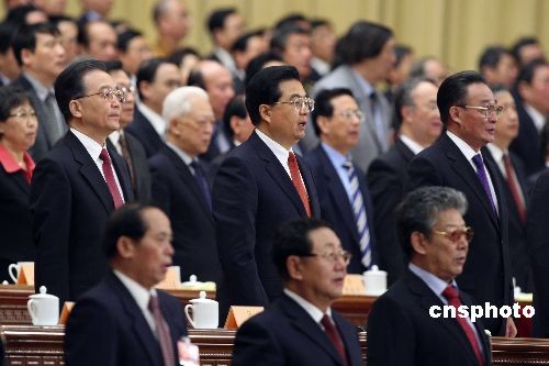 3月12日9時(shí),中國(guó)人民政治協(xié)商會(huì)議第十一屆全國(guó)委員會(huì)第二次會(huì)議在北京人民大會(huì)堂舉行閉幕會(huì),全體委員在閉幕式上唱國(guó)歌。中新社發(fā) 盛佳鵬 攝