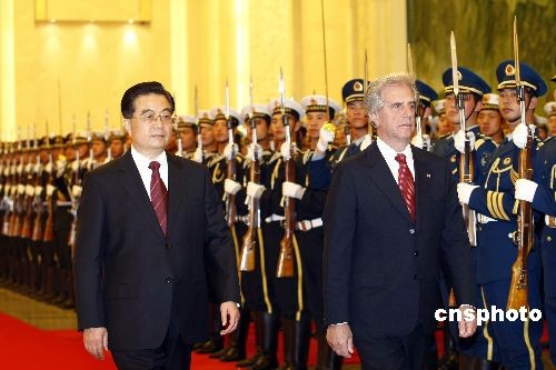 3月23日,中國(guó)國(guó)家主席胡錦濤在北京人民大會(huì)堂舉行儀式歡迎烏拉圭總統(tǒng)巴斯克斯訪(fǎng)華。中新社發(fā) 盛佳鵬 攝