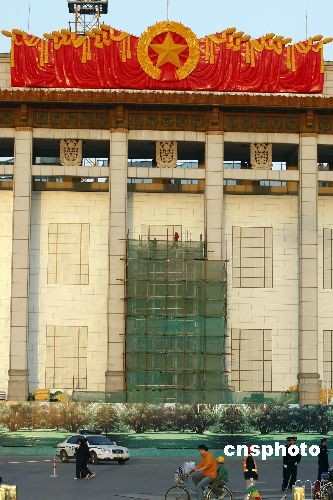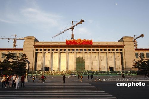 4月6日,中國國家博物館西門前罩上了綠色圍擋,工作人員正在加緊搭建上海世博會(huì)倒計(jì)時(shí)牌。據(jù)悉,該倒計(jì)時(shí)牌將于2009年5月1日上海世博會(huì)倒計(jì)時(shí)一周年之際正式亮相。全國政協(xié)常委、上海世博會(huì)執(zhí)委會(huì)執(zhí)行主任萬季飛在“兩會(huì)”期間表示,上海世博會(huì)將于明年5月1日開幕,在倒計(jì)時(shí)一周年之際,組委會(huì)將于今年5月1日在天安門廣場和國家博物館西門前豎立上海世博會(huì)倒計(jì)時(shí)牌,7月5日到15日將在首都博物館舉辦走進(jìn)世博會(huì)大型巡展。中新社發(fā) 鄭雄增 攝