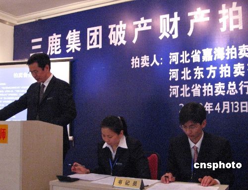 4月13日,由河北省嘉海拍賣有限公司作為主拍單位,與河北省東方拍賣有限公司、河北省拍賣總行有限公司共同進(jìn)行拍賣三鹿集團(tuán)部分資產(chǎn)。當(dāng)日拍賣的11項(xiàng)破產(chǎn)財(cái)產(chǎn),競(jìng)買人顯然無(wú)意出手,其中天津三鹿乳業(yè)51%的股權(quán)竟叫出20萬(wàn)元的起拍價(jià),最終也無(wú)人問(wèn)津,三鹿集團(tuán)第4批破產(chǎn)財(cái)產(chǎn)全部流拍。中新社發(fā) 翟羽佳 攝