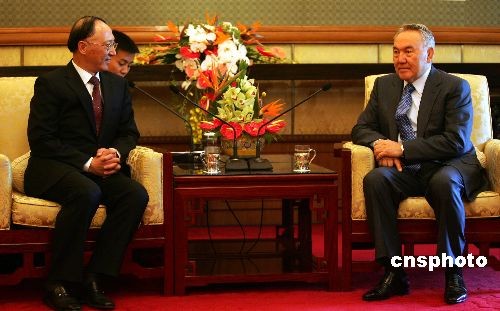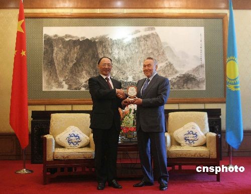 4月16日,中國國家體育總局局長、中國奧委會(huì)主席劉鵬在北京釣魚臺國賓館會(huì)見哈薩克斯坦總統(tǒng)納扎爾巴耶夫,并向納扎爾巴耶夫總統(tǒng)頒發(fā)中國奧委會(huì)勛章,以表示其對中國體育事業(yè)的支持。納扎爾巴耶夫此行是應(yīng)中國國家主席胡錦濤邀請,于15日傍晚抵達(dá)北京,開始對中國進(jìn)行為期5天的國事訪問。訪華期間,納扎爾巴耶夫?qū)⑴c中國國家主席胡錦濤、全國人大常委會(huì)委員長吳邦國和國務(wù)院總理溫家寶進(jìn)行會(huì)見,他還將出席博鰲亞洲論壇2009年年會(huì),這是納扎爾巴耶夫2005年連任總統(tǒng)以來第2次對中國進(jìn)行國事訪問。中新社發(fā) 富田 攝