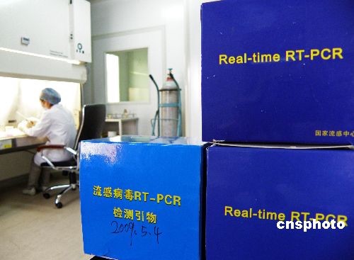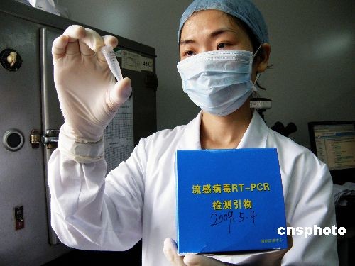 2009年5月5日,湖北省宜昌市疾病預(yù)防控制中心國家級流感網(wǎng)絡(luò)實驗室內(nèi),工作人員在展示和預(yù)實驗甲型H1N1流感病毒快速診斷試劑。甲型H1N1流感病毒快速診斷試劑由中國疾病預(yù)防控制中心和中國醫(yī)學(xué)科學(xué)院研制,可以在12小時內(nèi)檢測出樣本是否攜帶甲型H1N1流感病毒。據(jù)悉,甲型H1N1流感病毒快速診斷試劑已于2009年5月4日配發(fā)到中國84個流感網(wǎng)絡(luò)實驗室。中新社發(fā) 劉君鳳 攝