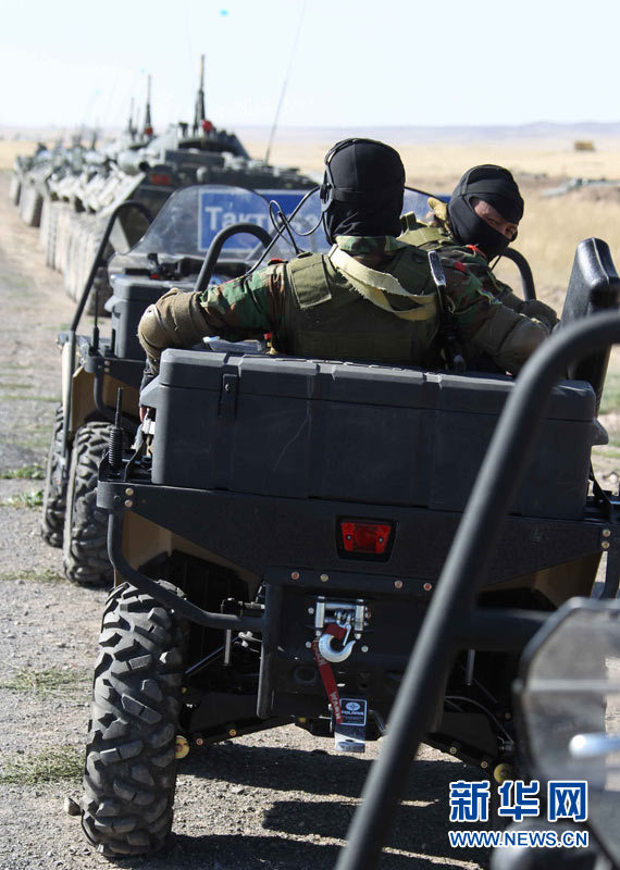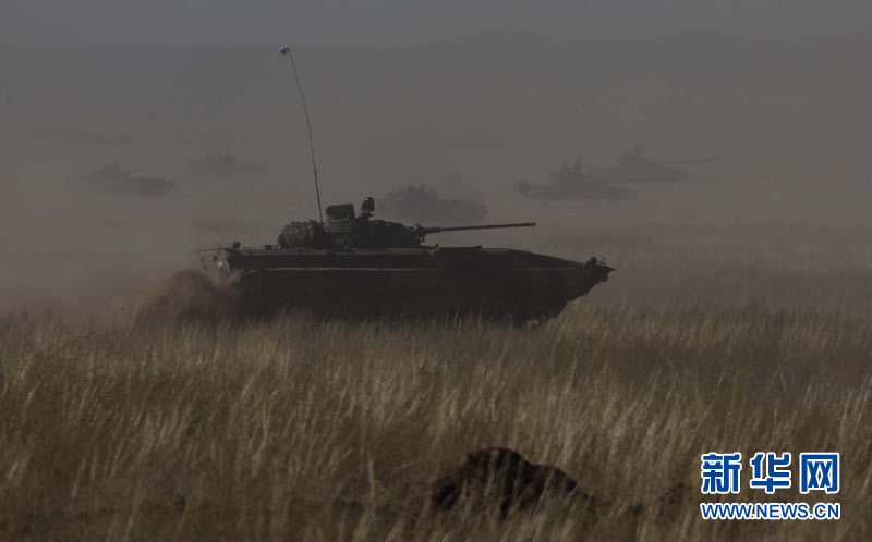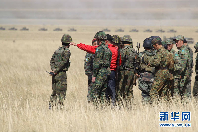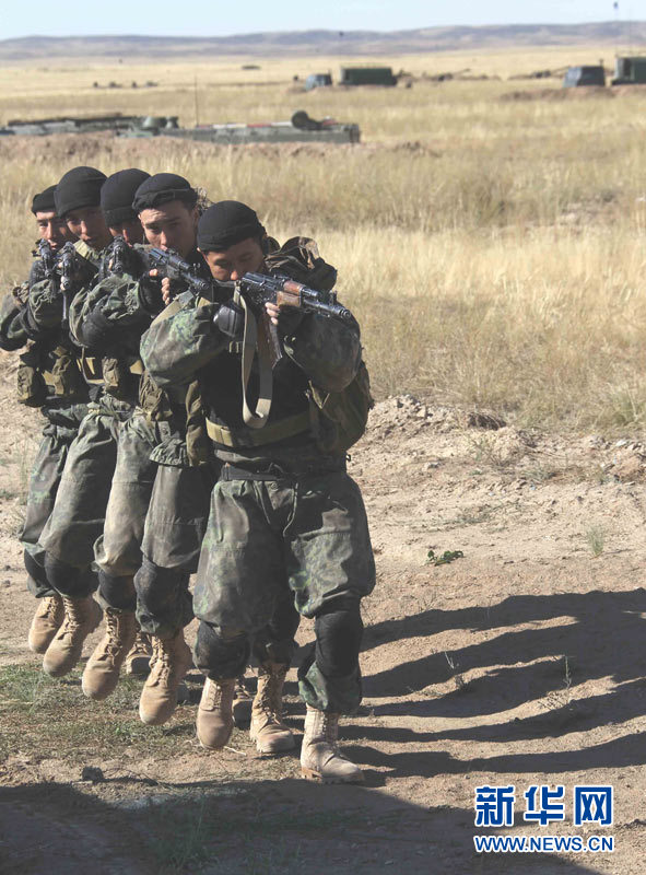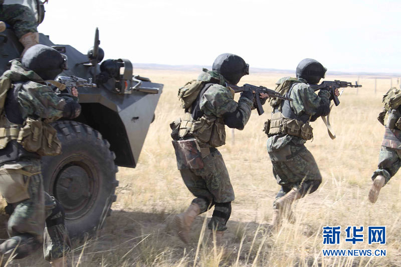 9月15日,參加上海合作組織成員國(guó)武裝力量聯(lián)合反恐軍事演習(xí)的哈薩克斯坦、中國(guó)、吉爾吉斯斯坦、俄羅斯、塔吉克斯坦五國(guó)參演部隊(duì)成功舉行第二次實(shí)兵合練。王建民 攝 圖片來(lái)源:新華網(wǎng)