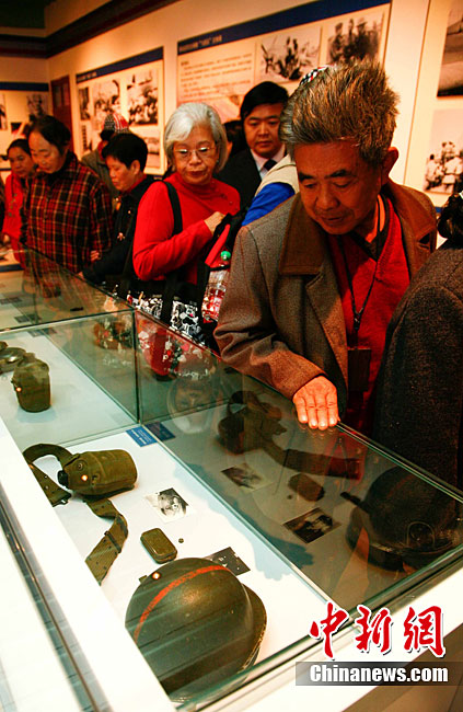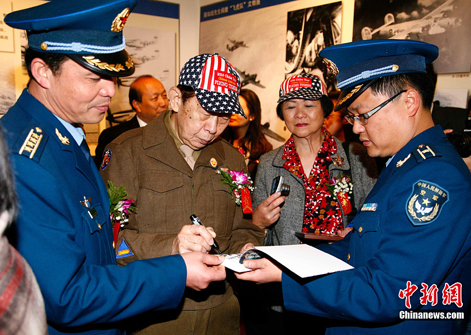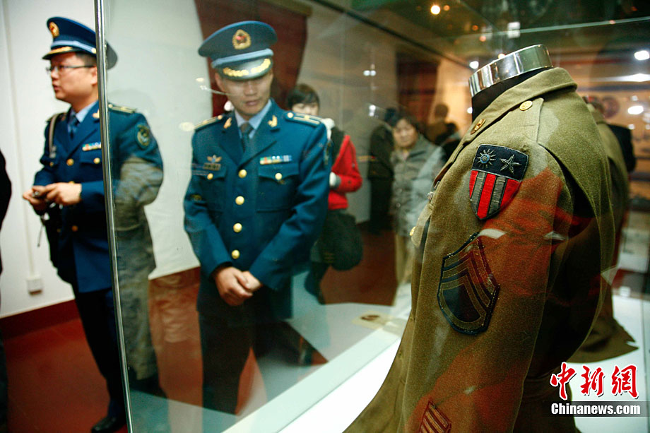 11月9日,由知名僑領(lǐng)陳燦培向昆明市捐贈的1100件飛虎隊文物在云南陸軍講武堂展出。創(chuàng)立于上個世紀(jì)40年代的飛虎隊,又稱中國空軍美國志愿援華航空隊。在抗日戰(zhàn)爭中對日作戰(zhàn),運送物資,戰(zhàn)果累累。圖為參觀展覽的空軍官兵。中新社記者 劉冉陽 攝