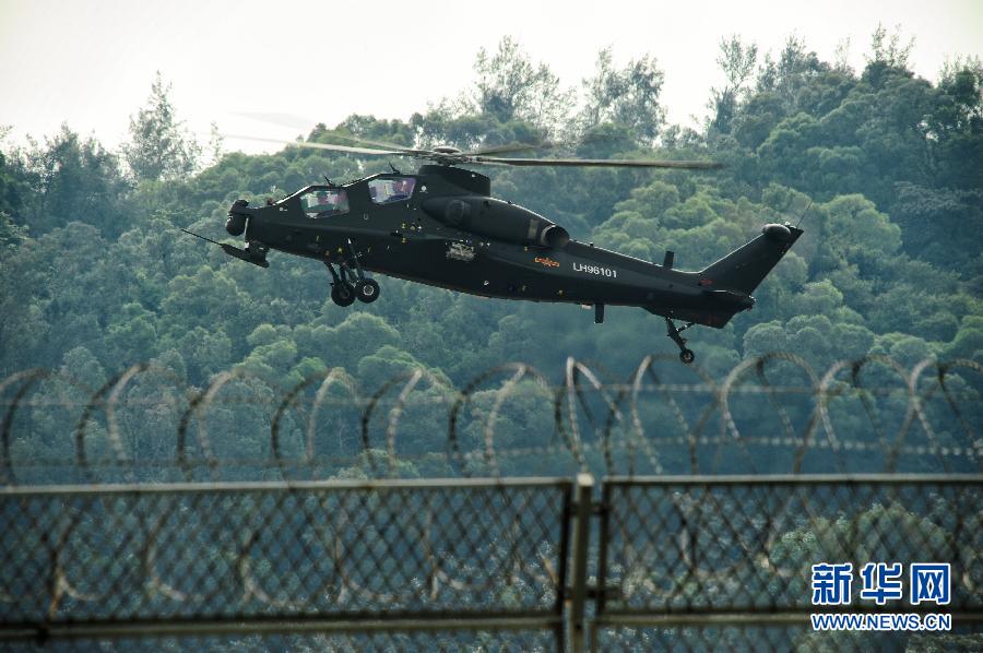 2012年11月11日,國產(chǎn)武直10武裝直升機(jī)在珠海三灶機(jī)場進(jìn)行飛行訓(xùn)練。當(dāng)日,我國自主研制生產(chǎn)的武直10武裝直升機(jī)在珠海三灶機(jī)場進(jìn)行了約20分鐘的適應(yīng)性飛行訓(xùn)練,做出倒飛、萊維斯曼機(jī)動(dòng)、高速大角度俯沖、低空小半徑盤旋等動(dòng)作,展現(xiàn)出其優(yōu)異性能,引來航展現(xiàn)場觀眾頻頻喝彩。楊光 攝 圖片來源:新華網(wǎng)