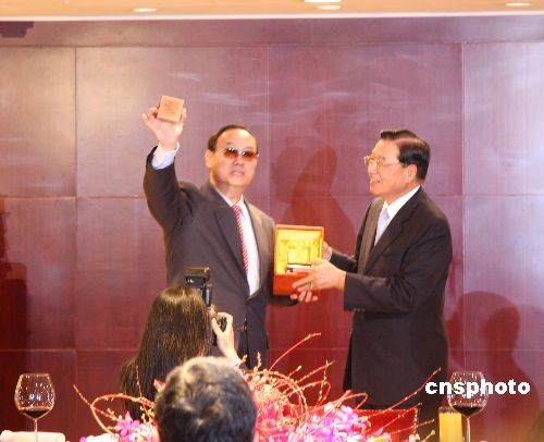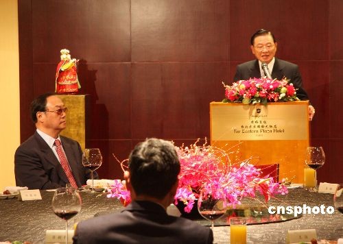 大陸海協(xié)會(huì)副會(huì)長(zhǎng)安民四月六日率“海協(xié)會(huì)經(jīng)貿(mào)交流考察團(tuán)”一行十四人抵達(dá)臺(tái)灣,開始為期七天的訪問(wèn)。臺(tái)灣;鶗(huì)董事長(zhǎng)江丙坤在香格里拉臺(tái)北遠(yuǎn)東國(guó)際大飯店宴請(qǐng)安民一行。 中新社發(fā) 耿軍 攝