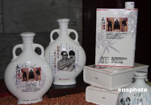 4月13日是蔣經(jīng)國先生百年誕辰,臺(tái)灣煙酒公司配合推出3款蔣經(jīng)國百年誕辰紀(jì)念酒。圖為其中一款仿古的白磁提耳瓶,在臺(tái)灣陶瓷重鎮(zhèn)鶯歌訂作陶瓷瓶身,裝入臺(tái)灣原窖高梁酒,一面印有1986年馬英九擔(dān)任翻譯時(shí),和經(jīng)國先生的合照。酒瓶的另一面印有蔣經(jīng)國先生抱著小女孩的合照,表現(xiàn)蔣經(jīng)國先生的親民形象。中新社發(fā) 耿軍 攝