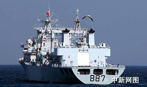 “海口”號導(dǎo)彈驅(qū)逐艦新春與“微山湖”號綜合補(bǔ)給艦在海上進(jìn)行補(bǔ)給時,一只海鷗從“微山湖”艦上空飛過。中新社記者 孫自法 攝