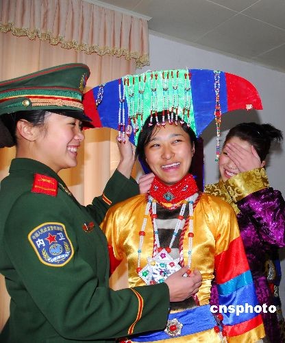 2月24日,武警西藏總隊(duì)的藏族官兵們穿著節(jié)日的盛裝,品嘗著精美可口的卡塞,跳起歡快的鍋莊,營區(qū)內(nèi)被濃濃年味包裹。該總隊(duì)為了讓藏族官兵們?cè)诰癄I里過上一個(gè)快樂祥和的新年(2月25日是藏歷新年),精心為他們準(zhǔn)備了酥油、糌粑、奶渣等節(jié)日佳肴,籌劃了形式多樣的藏文化活動(dòng),使藏族官兵們感受到了部隊(duì)的溫暖。圖為官兵們正在進(jìn)行精心打扮。中新社發(fā) 張權(quán) 攝