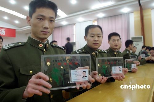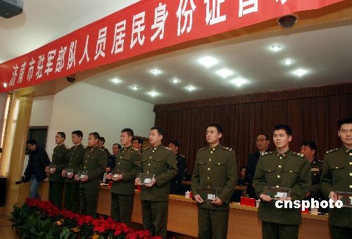 2009年2月26日,濟(jì)南警備區(qū)、濟(jì)南市公安局聯(lián)合舉行駐濟(jì)部隊現(xiàn)役軍人居民身份證首發(fā)儀式。自此,濟(jì)南市為駐濟(jì)部隊申領(lǐng)發(fā)放具名身份證工作正式啟動。此舉將對部隊人員辦理儲蓄、保險、買車、購房等涉及個人權(quán)益事物時帶來便捷。中新社發(fā) 龔輝 攝