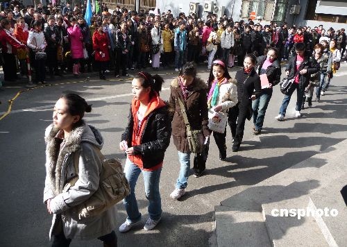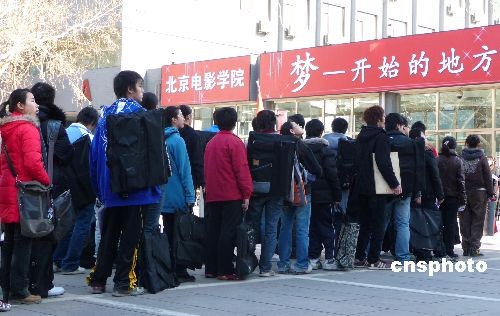 2009年2月7日,北京電影學(xué)院2009年招生初試工作已進(jìn)入了第三天,一批批來自全國(guó)各地的考生繼續(xù)為圓明星夢(mèng)而拼搏努力。今年最顯著的特點(diǎn)是本色考生越來越多,濃妝艷抹、奇裝異服的考生少了。據(jù)悉,表演專業(yè)一直被認(rèn)為是北影“最難考的專業(yè)”,雖然今年的招生人數(shù)由往年的30人增加到75人,但面對(duì)4234名報(bào)考者,淘汰率仍高達(dá)98.2%。一位考官告訴記者,雖然報(bào)名者很多,但有充分準(zhǔn)備、專業(yè)水平較高的考生不超過千人,還是有很多考生很盲目。中新社發(fā) 玉龍 攝