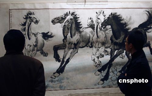 3月10日,“中國現(xiàn)代美術(shù)奠基人系列展·徐悲鴻大型藝術(shù)展”在北京炎黃藝術(shù)館舉行,一幅著名的國畫作品《群奔》吸引參觀者目光。本次展覽由北京市文化局、徐悲鴻紀念館和炎黃藝術(shù)館聯(lián)合主辦,共展出80多件徐悲鴻真跡,涵蓋了徐先生各個時期的代表作,其中包括他早期的素描《馬與馬夫》、《女人體》、《自畫像》等。中新社發(fā) 鄭雄增 攝