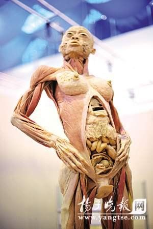整個(gè)展會(huì)上最“大牌”的展品,就應(yīng)該算“母子同體”人體標(biāo)本了。記者了解到,這也是世界上唯一一具女性妊娠標(biāo)本。這個(gè)懷孕3個(gè)月的母親雙手摸著腹部,安詳?shù)靥魍h(yuǎn)處,仿佛在期待著孩子的健康成長(zhǎng)。這個(gè)標(biāo)本主要體現(xiàn)的是女性生殖系統(tǒng)的組成,更難能可貴的是,這個(gè)標(biāo)本展示了胎兒在母體中的發(fā)育情況,讓人們非常直觀地了解了女性妊娠的科普知識(shí)。主辦方告訴記者,這個(gè)標(biāo)本得來也很不容易,“她的家人把她的遺體捐獻(xiàn)出來時(shí)還不知道她已經(jīng)懷了孕。當(dāng)我們解剖遺體制作標(biāo)本時(shí)發(fā)現(xiàn),她已懷了12周的身孕。所以這具‘母子同體’的人體標(biāo)本是我國(guó)唯一的一具!