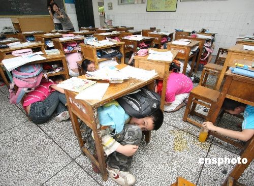 5月12日,重慶江北華新實(shí)驗(yàn)小學(xué)的孩子們?cè)趯W(xué)習(xí)災(zāi)害發(fā)生時(shí)的緊急避難知識(shí)。當(dāng)日是首個(gè)“防災(zāi)減災(zāi)日”,重慶各學(xué)校紛紛進(jìn)行防災(zāi)避難課和災(zāi)害發(fā)生時(shí)的緊急避難及人員疏散演練,提高孩子們?cè)跒?zāi)害發(fā)生時(shí)的自我保護(hù)意識(shí)和掌握各種臨時(shí)避難方法。中新社發(fā) 賀終榮 攝