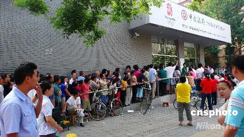 北京社區(qū)居民晝夜排隊兌換奧運紀(jì)念鈔。中新社發(fā) 張愛東 攝