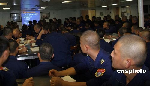 圖為官兵學(xué)習(xí)護(hù)航行動(dòng)相關(guān)法律知識(shí)。中新社發(fā) 孫自法 攝