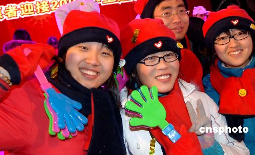 北京:2009年元旦零時(shí)到來(lái)時(shí)刻,北京600多名志愿者及社會(huì)名流在鐘鼓樓廣場(chǎng)聚會(huì),參加北京志愿者協(xié)會(huì)等部門共同舉辦的“微笑北京,和諧先鋒”主題活動(dòng),并狂歡慶新年到來(lái)。此活動(dòng)是600名志愿者和社會(huì)名流參會(huì)。北京奧運(yùn)會(huì)期間,10萬(wàn)賽會(huì)志愿者、100萬(wàn)社會(huì)志愿者、40萬(wàn)城市志愿者和20萬(wàn)拉拉隊(duì)志愿者在各類服務(wù)領(lǐng)域累計(jì)服務(wù)超過(guò)2億小時(shí)。 中新社發(fā) 鄒憲 攝