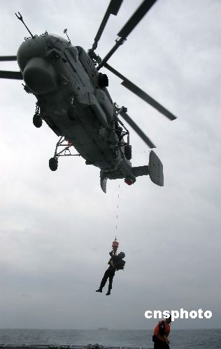 2009年元旦,中國(guó)海軍護(hù)航艦艇編隊(duì)正在印度洋航行,圖為“?凇迸灪叫型局虚_展艦機(jī)與隨艦特戰(zhàn)隊(duì)員的協(xié)同訓(xùn)練。中新社發(fā) 孫自法 攝