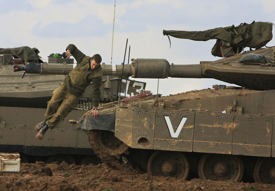 12月31日,在加沙邊境地區(qū),以軍集結(jié)大量坦克和士兵。圖為一名以軍士兵正從一輛坦克上跳下。目前,面對(duì)國際社會(huì)巨大壓力,以色列仍然拒絕停止對(duì)加沙地帶的大規(guī)?找u。