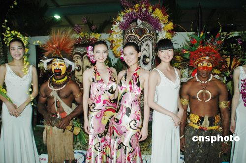 圖為來自巴布亞新幾內(nèi)亞的蘭花參展商在展臺(tái)前展示本國獨(dú)特的民族文化,吸引參會(huì)模特們合影留念。中新社發(fā) 尹海明 攝
