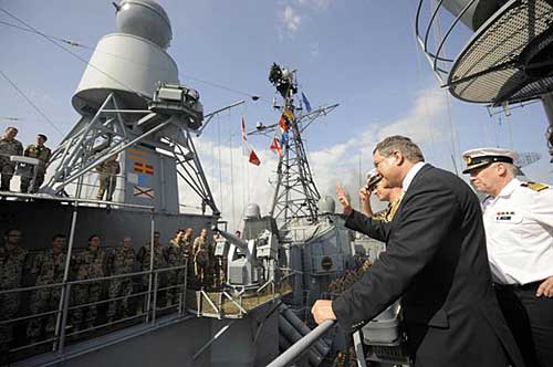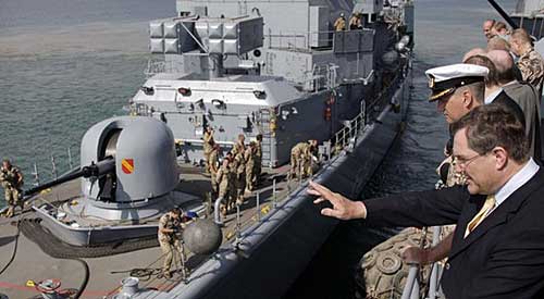 德國(guó)國(guó)防部長(zhǎng)弗朗茨·約瑟夫·容為參加歐盟領(lǐng)導(dǎo)的打擊海盜行動(dòng)的德國(guó)官兵送行。