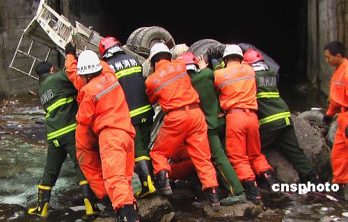 印江消防隊(duì)員正在對(duì)掉進(jìn)印江河右岸泄洪洞的貨車實(shí)施救援。 中新社發(fā) 陳曉嵐 攝