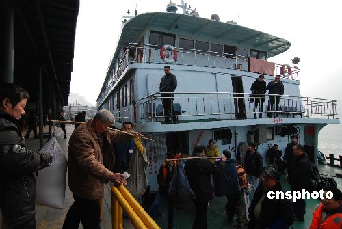 2009年1月8日,在三峽重慶庫區(qū)云陽縣港務站碼頭,旅客乘船出行。長江航務部門近日傳出消息,今年春運三峽庫區(qū)將投入跨省客船109艘、43115個客位,預計春運期間跨省運送旅客42萬人次。有關部門將在1月10日前完成參運船舶的安全檢驗。中新社發(fā) 劉小洋 攝
