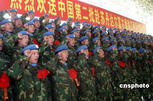 2009年1月10日,在濟南國際機場,有關(guān)部門為中國第二批赴蘇丹達爾富爾維和工程兵大隊第一梯隊153名官兵舉行了歡送儀式。據(jù)悉,此次擔任維和任務(wù)的官兵主要來自濟南軍區(qū)和北京軍區(qū),他們將擔負修建和維護道路、橋梁、建筑物、停機坪和防御工事,勘察水源、鉆井、修建取水輔助設(shè)施等工程保障任務(wù)。