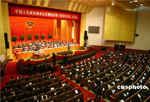1月10日下午3時,政協(xié)湖南省第十屆委員會第二次會議在湖南省軍區(qū)禮堂隆重開幕。來自社會各界的政協(xié)委員、旁聽代表等共計700余人與會,將在為期5天的會議中為湖南發(fā)展建言獻策。中新社發(fā) 傅煜 攝
