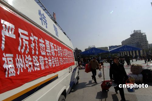 福州火車站廣場張貼舉報(bào)電話嚴(yán)打票販子。